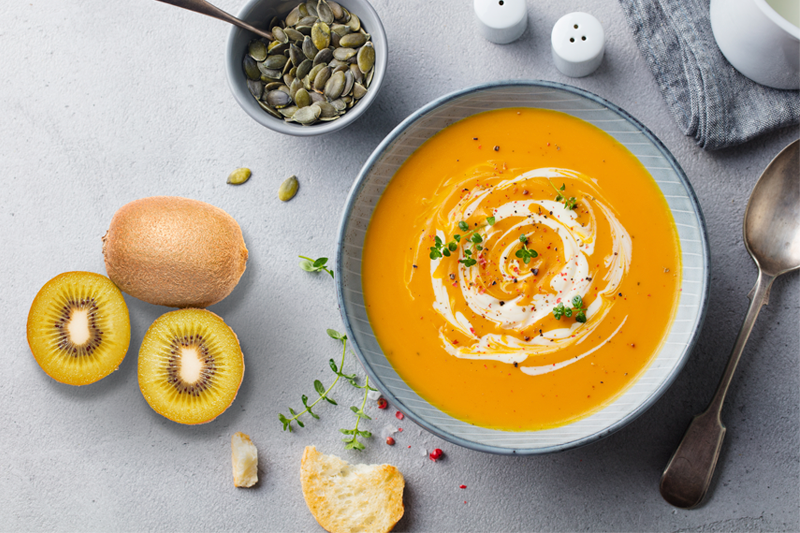 Una volta che la crema è pronta, frullatela con un mixer fino a ottenere una consistenza omogenea e cremosa. Servite la crema aggiungendo i kiwi a pezzetti, i cubetti di formaggio e i crostini di pane dorati.