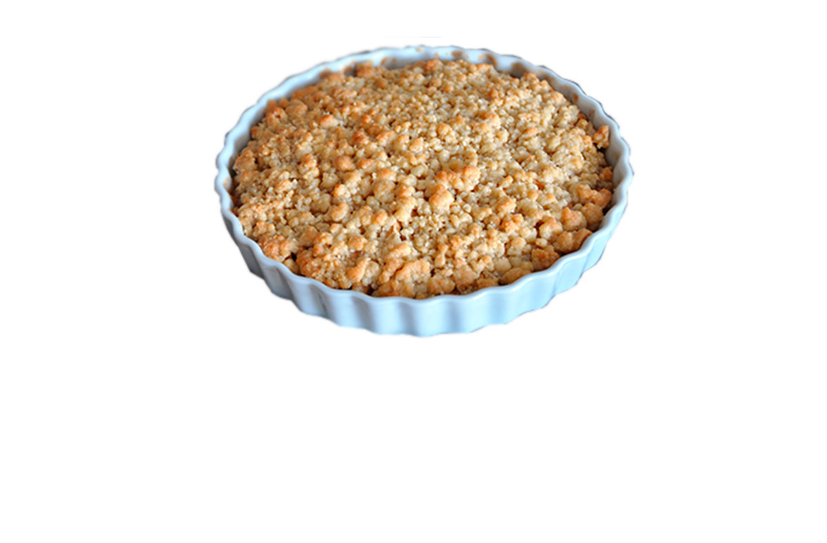 Prendete delle cocotte monoporzione o una teglia di 24 cm di diametro e imburratele. Aggiungete uno strato di mele a pezzetti e poi coprite con le briciole di pasta.