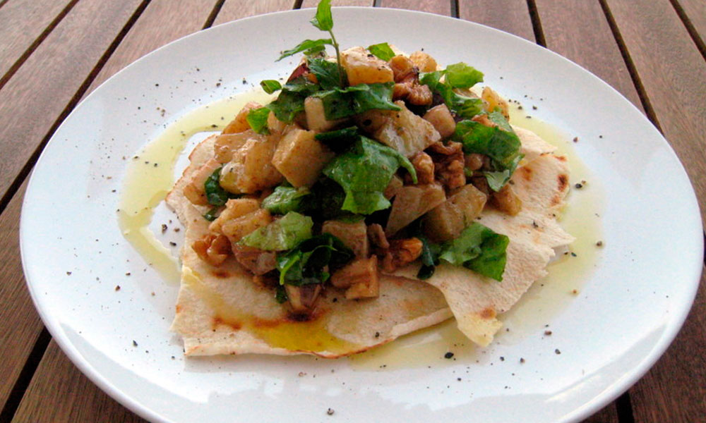 Versate il condimento sull’insalata, mescolate e amalgamate il tutto prima di servire su un letto di pane carasau.