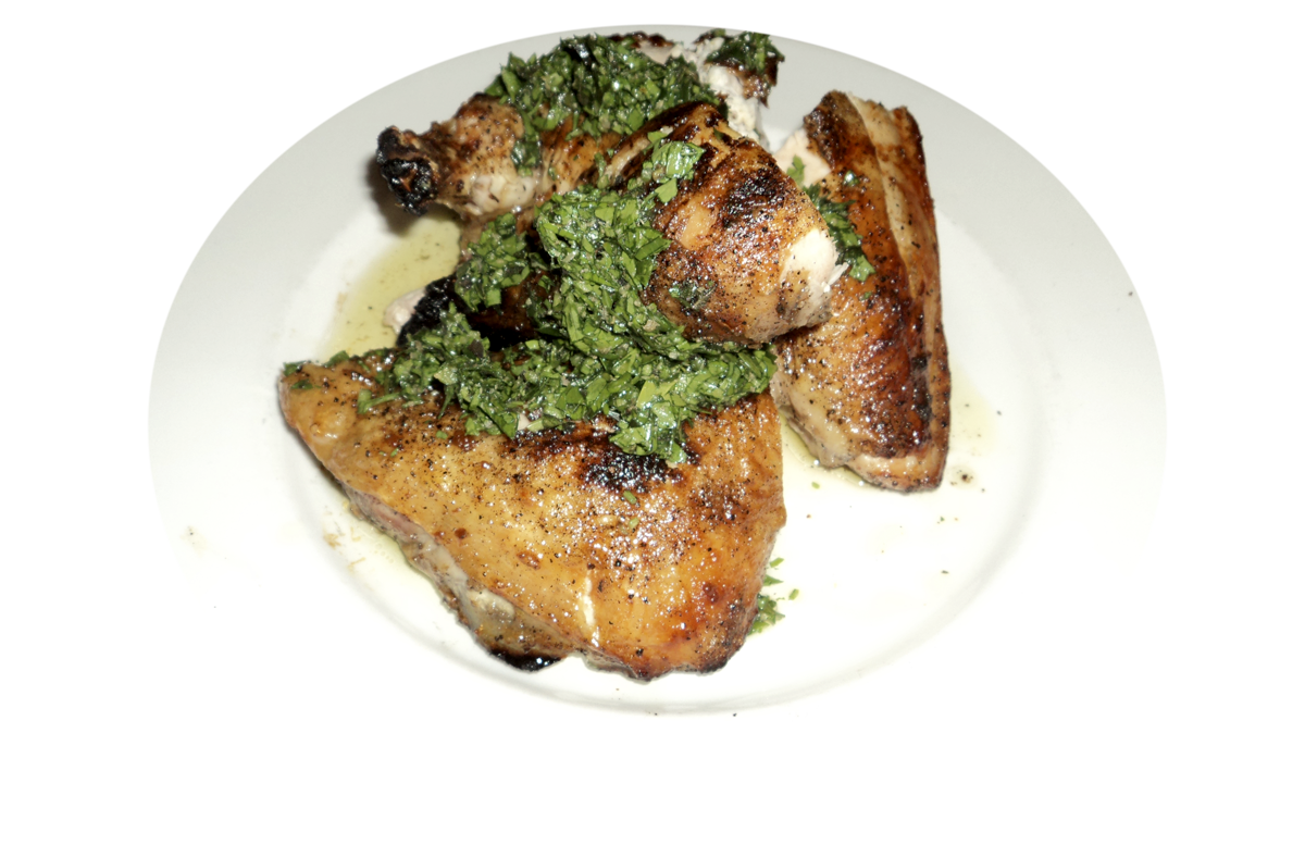 Mettete dell’insalata in una ciotola, aggiungete le listarelle di petti di pollo e conditeli con la salsina verde ottenuta.